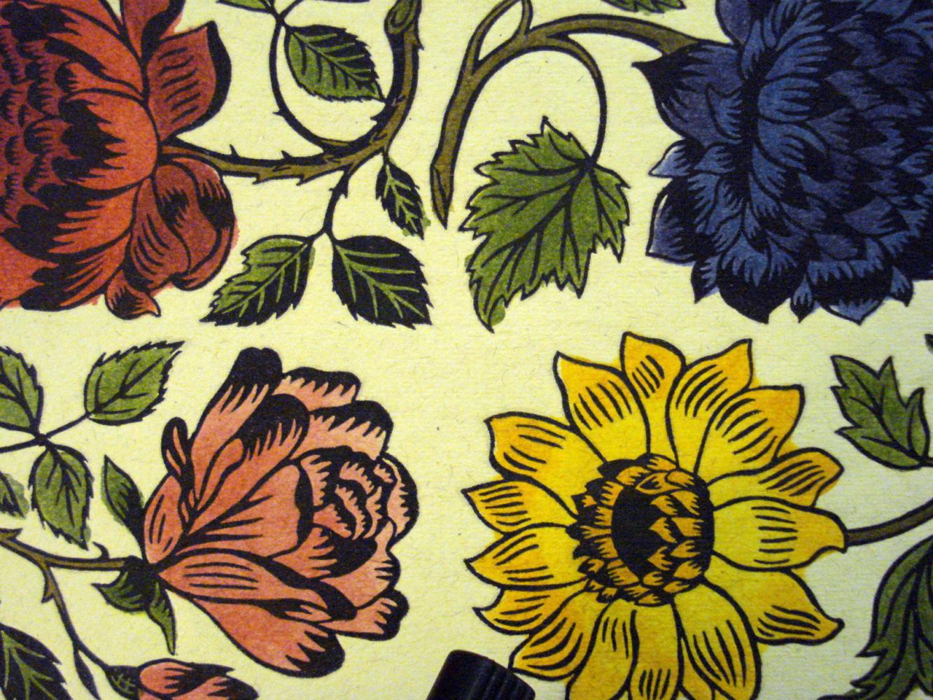 These are a selection of hand cut, printed, and coloured block and paste papers. As well as traditional marble papers, Pete uses these papers on his bindings, and keeps a stock available for sale.