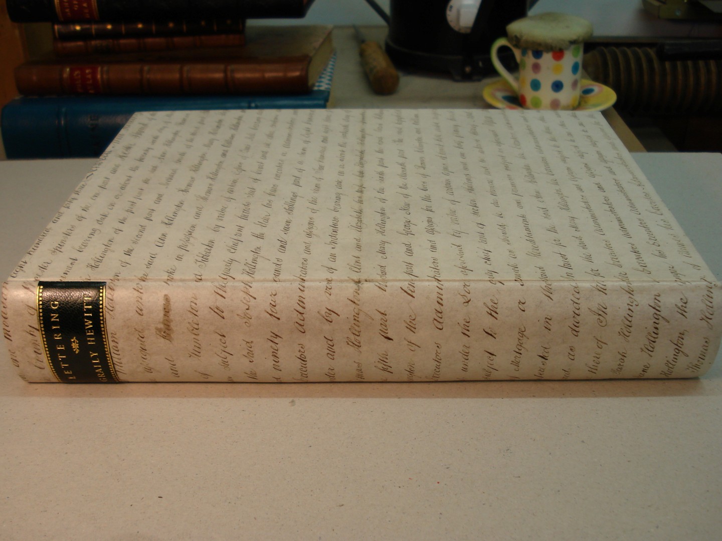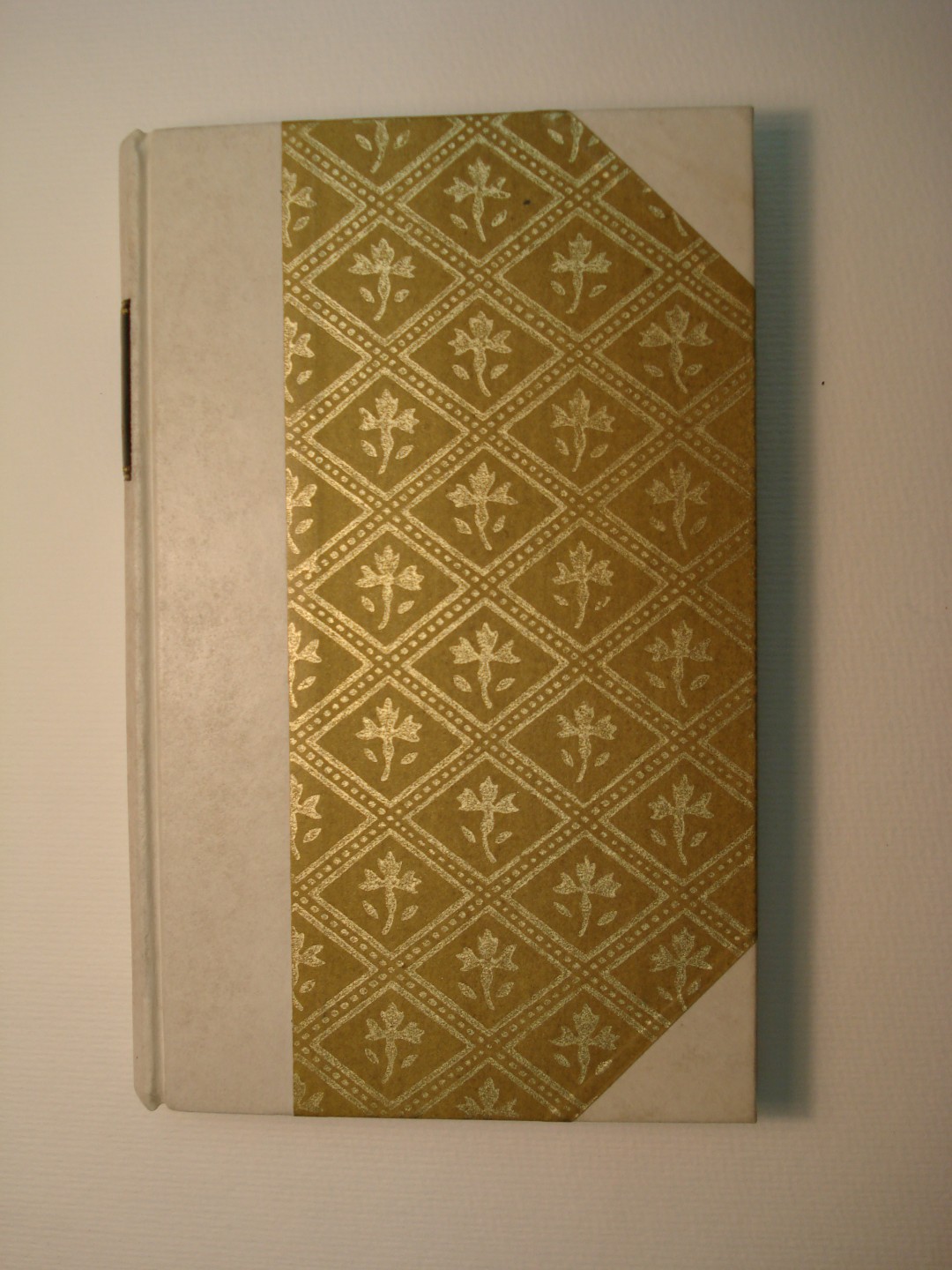 Half vellum case with decorative paper sides and a leather label.