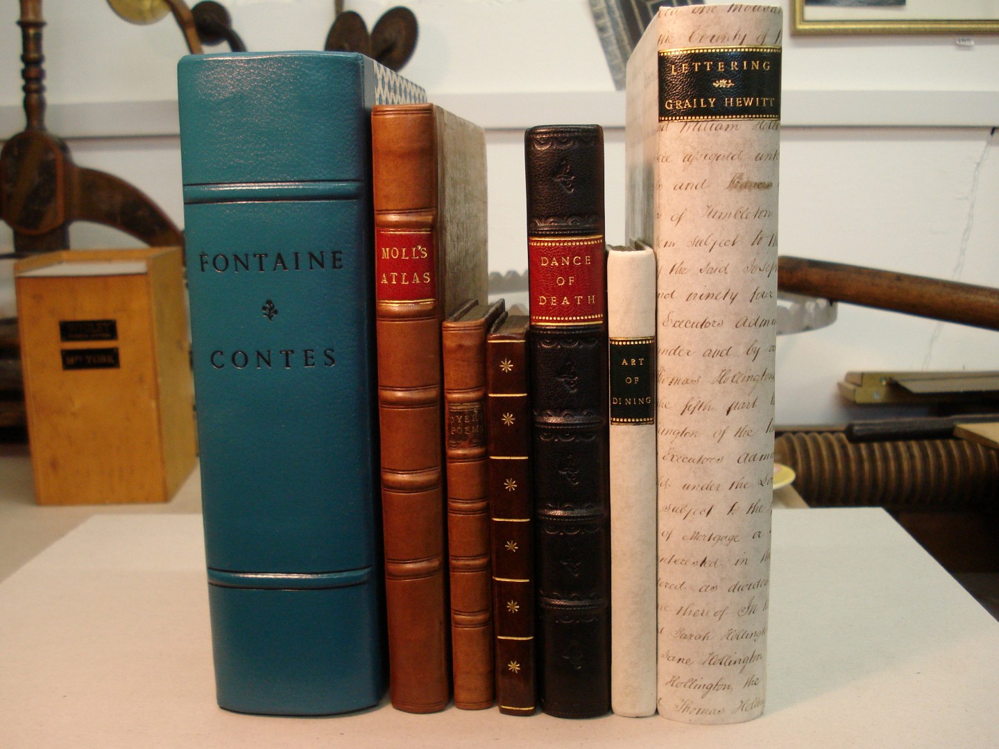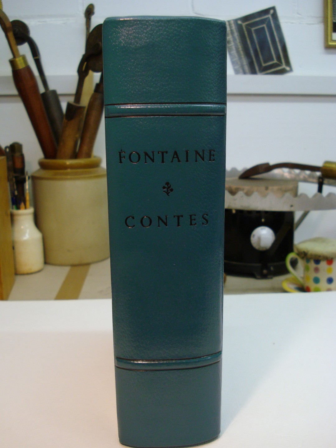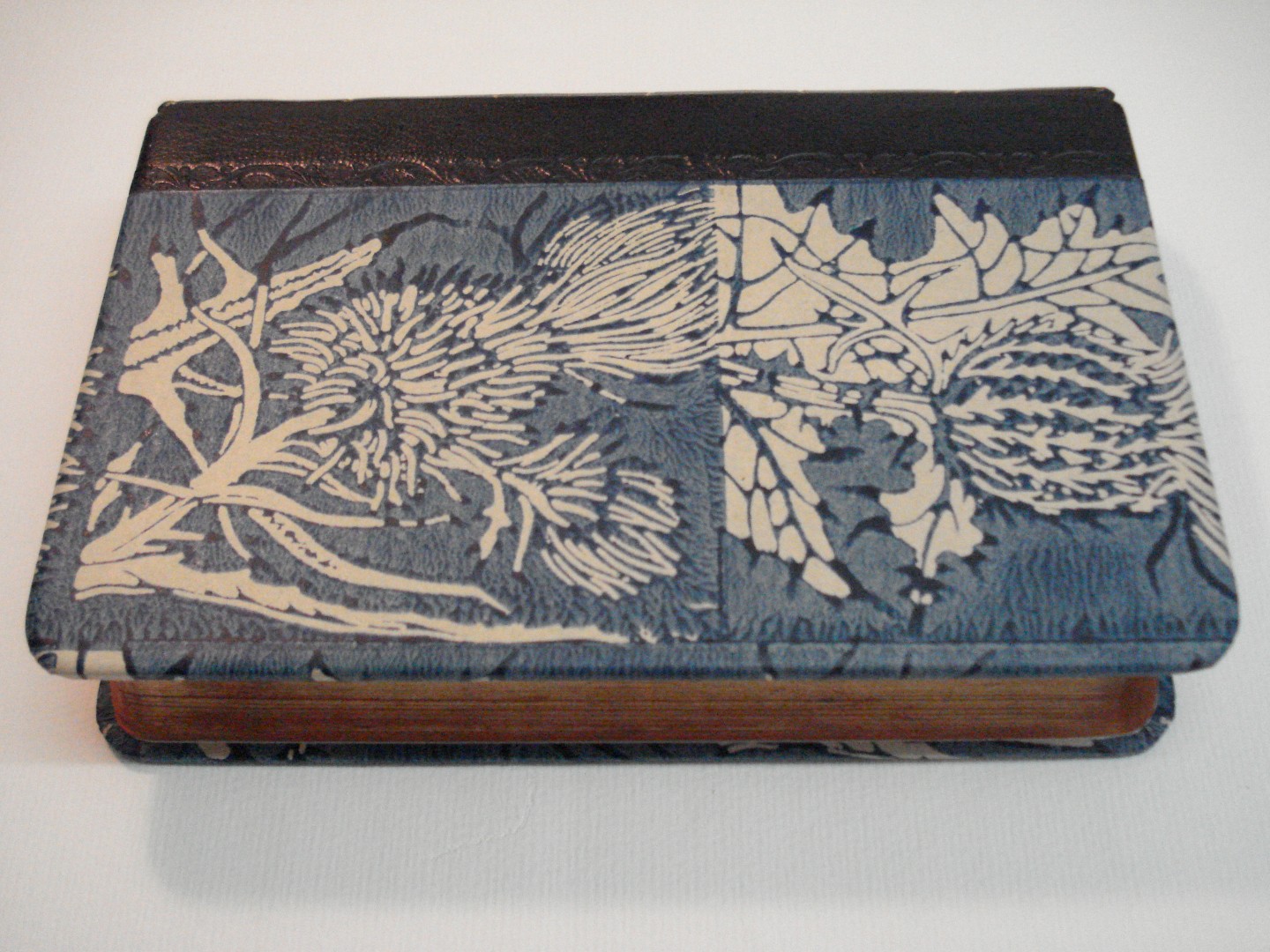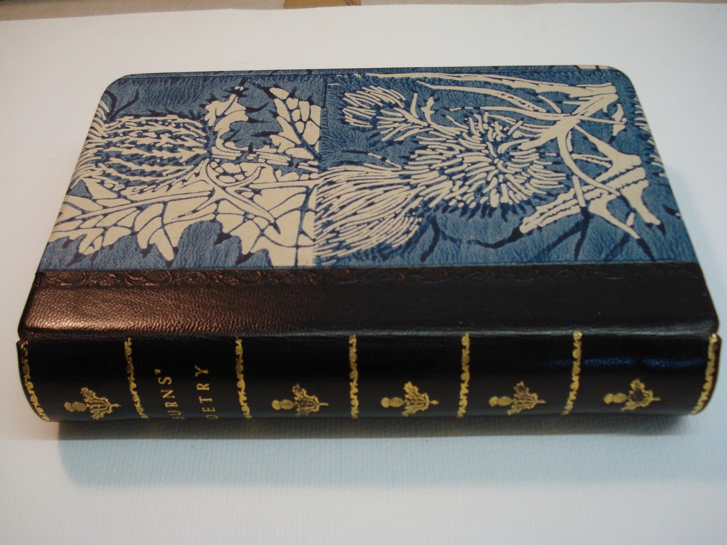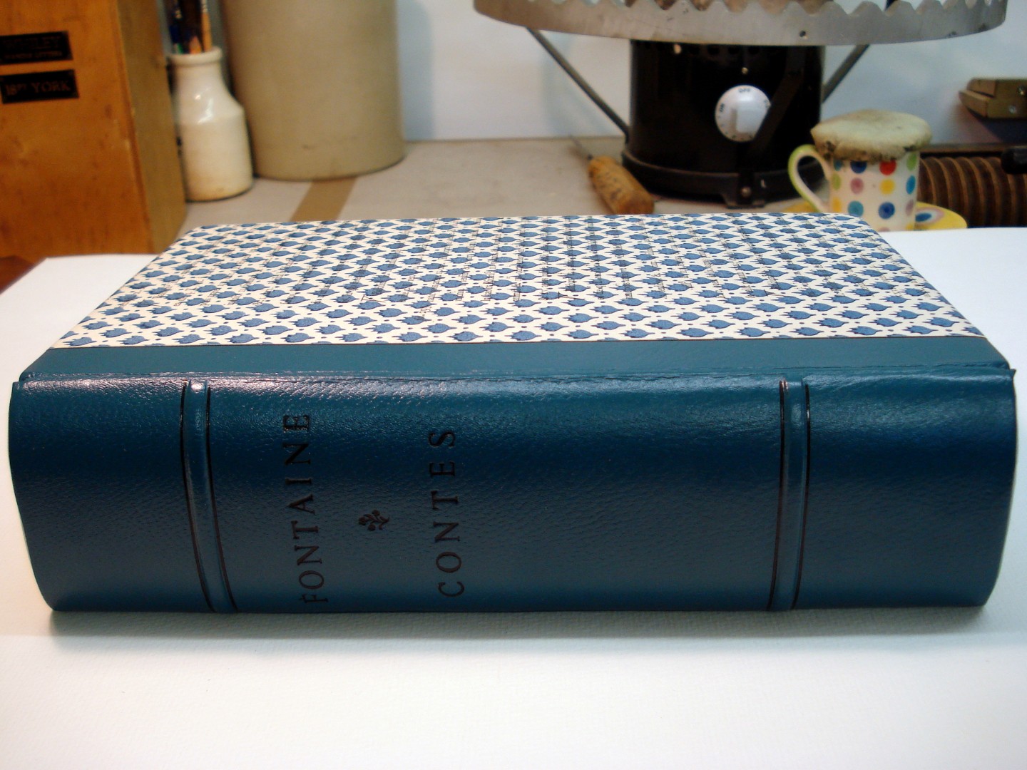 Quarter leather binding, morocco spine with block printed paste paper sides.