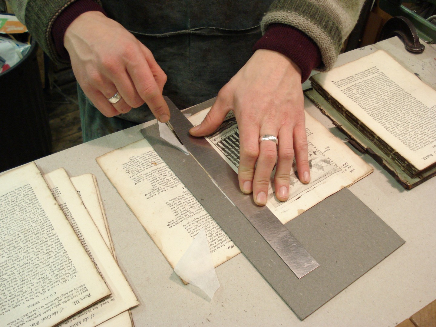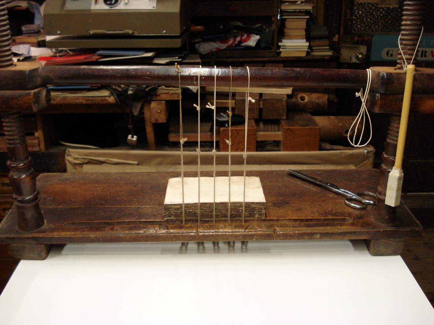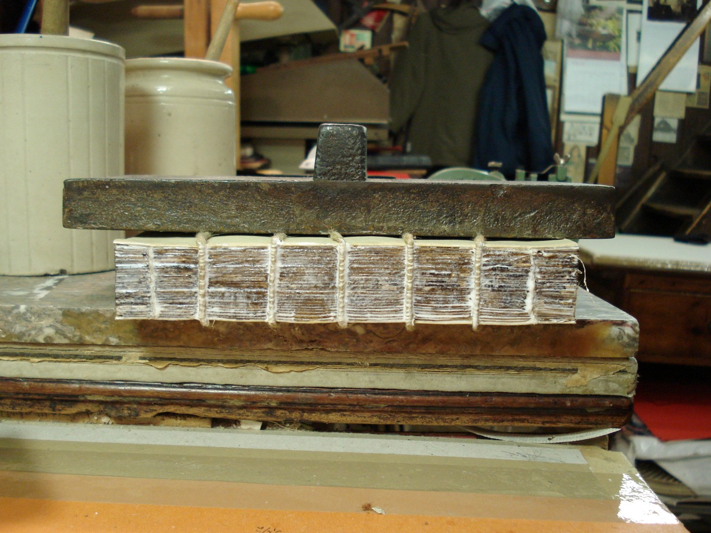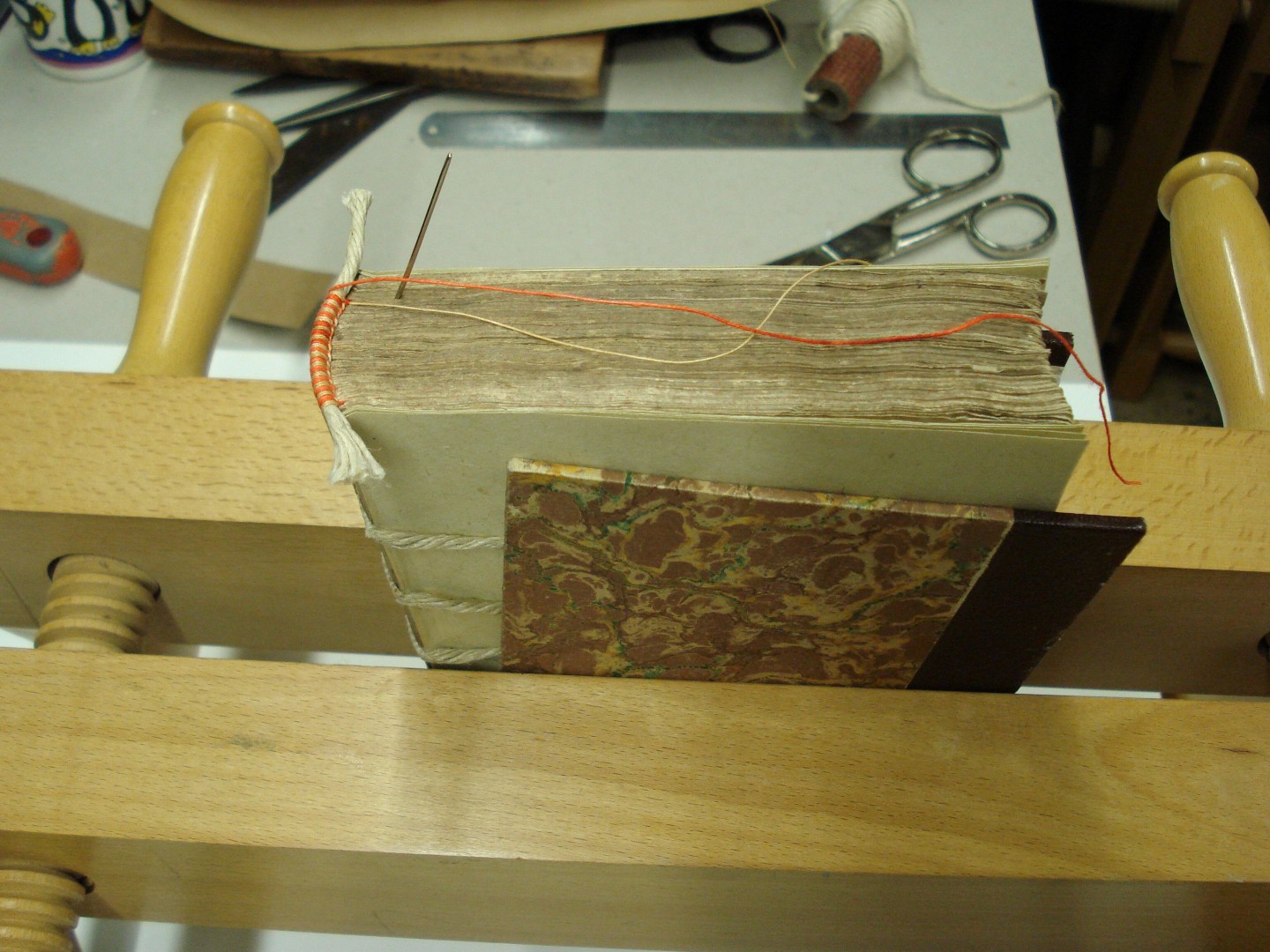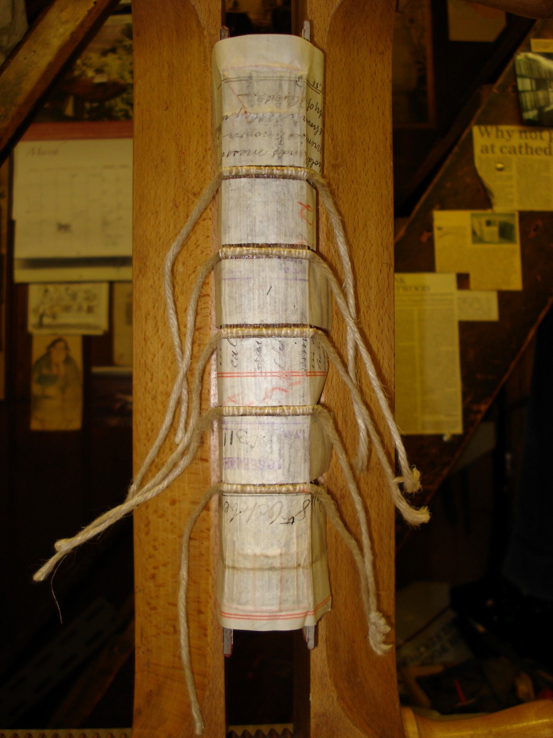 Loose sections about to be sewn on a sewing frame.