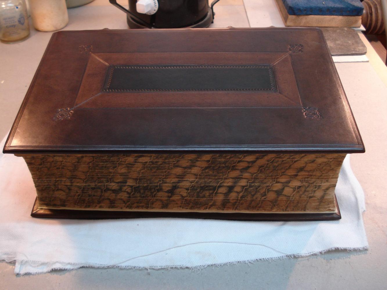 A very large family bible, rebacked in calf with a polished panel instead of a label on the spine.