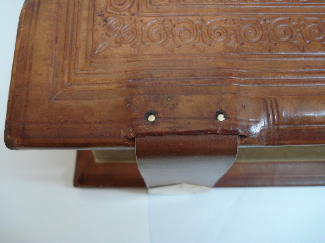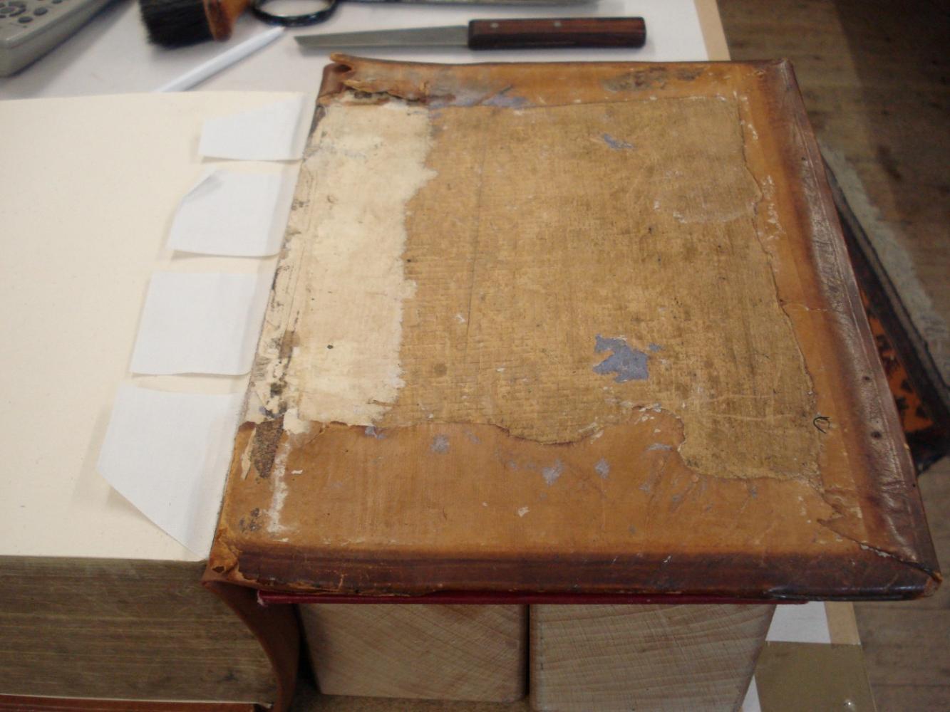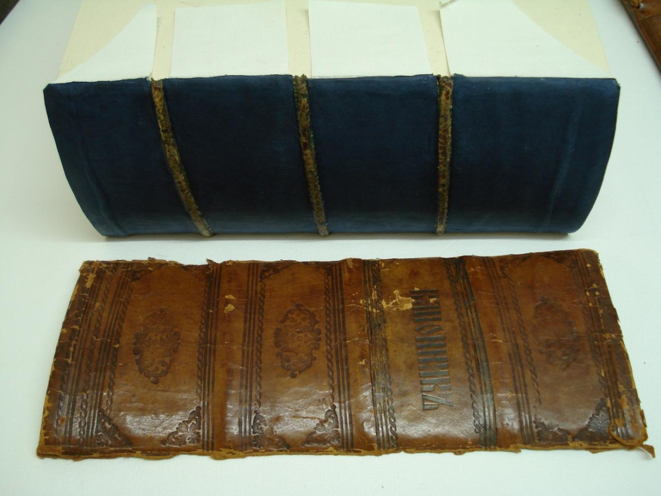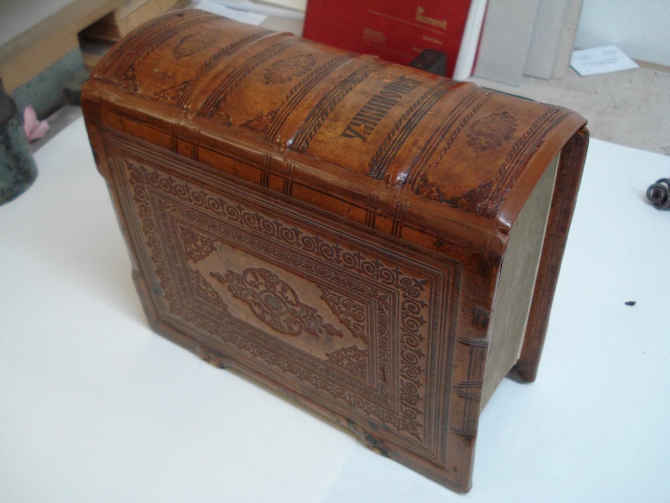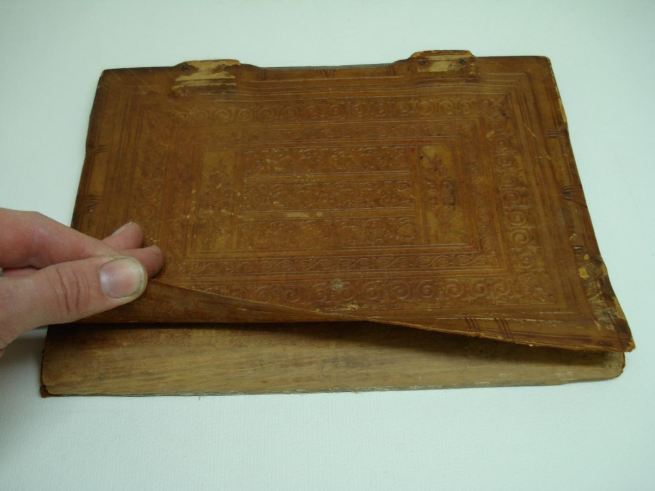 This was a large early 19th century Russian Bible, originally bound in full leather on wooden boards with brass clasps. When it came in for restoration it was missing both clasps, the endpapers (which were highly acidic) had perished, and one board was detached. I rebacked the bible, replacing the endpapers and brass clasps, and relaying the original spine back over a new one. These photos illustrate various stages of the restoration.