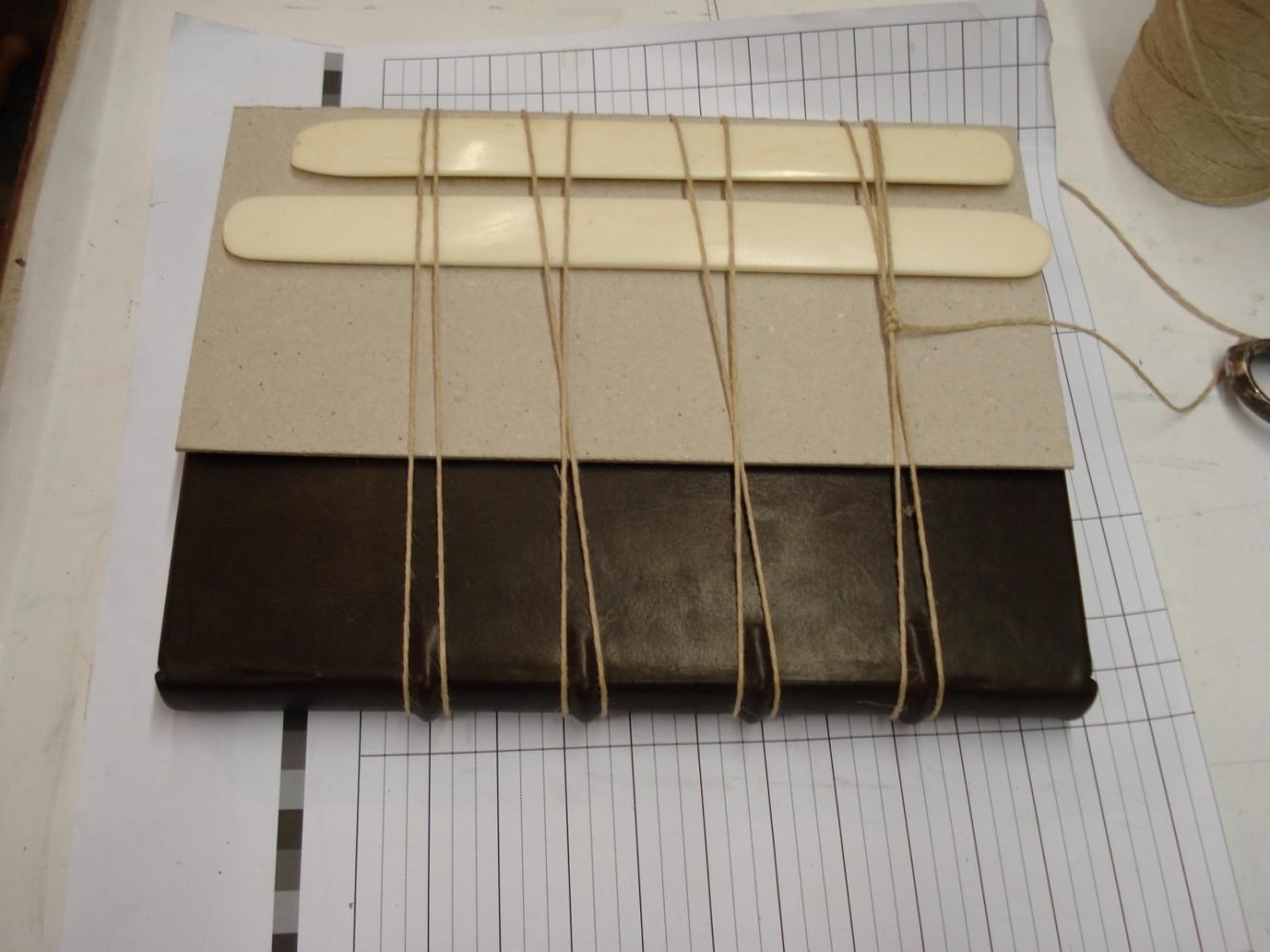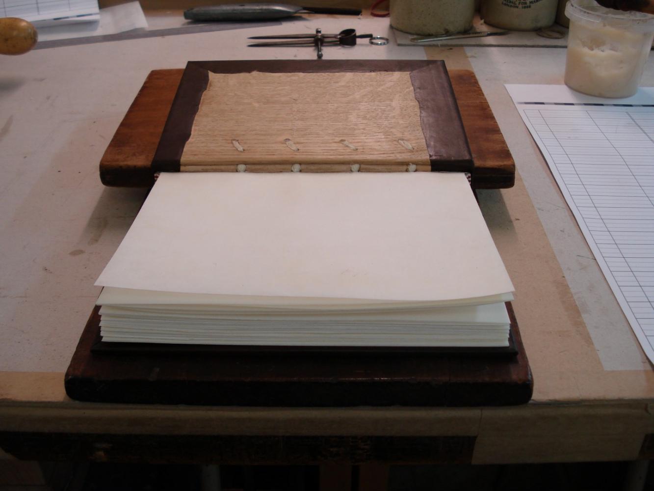 This is a family history which I bound in full leather on oak boards with heavy raised bands, and blind tooled in the style of a binding of around 1500. The pages of the book are folded sections of manuscript vellom which I sewed onto heavy cords in a sewing frame. I had brass clasps made for this job as it was going to be filled with gilt illuminations, and would therefore benefit from being held clamped shut. I kept a record of some of the processes involved in the binding.