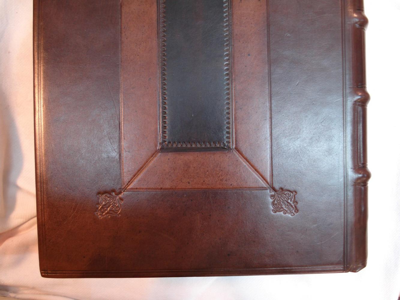 Large half leather binding, calf with morocco label, vellum manuscript deed on sides.