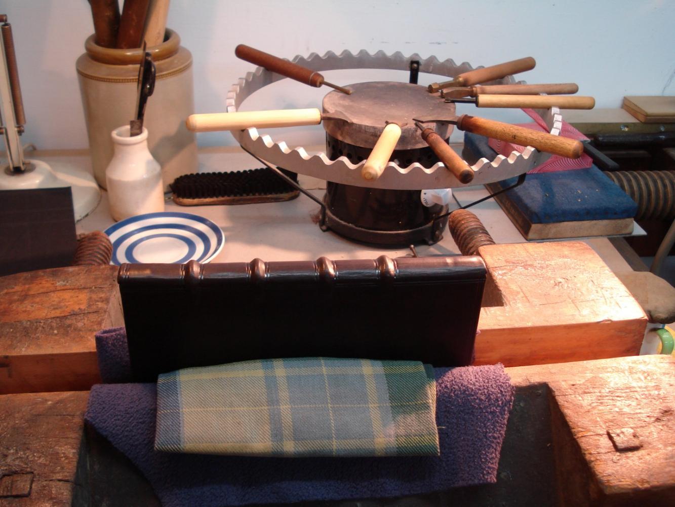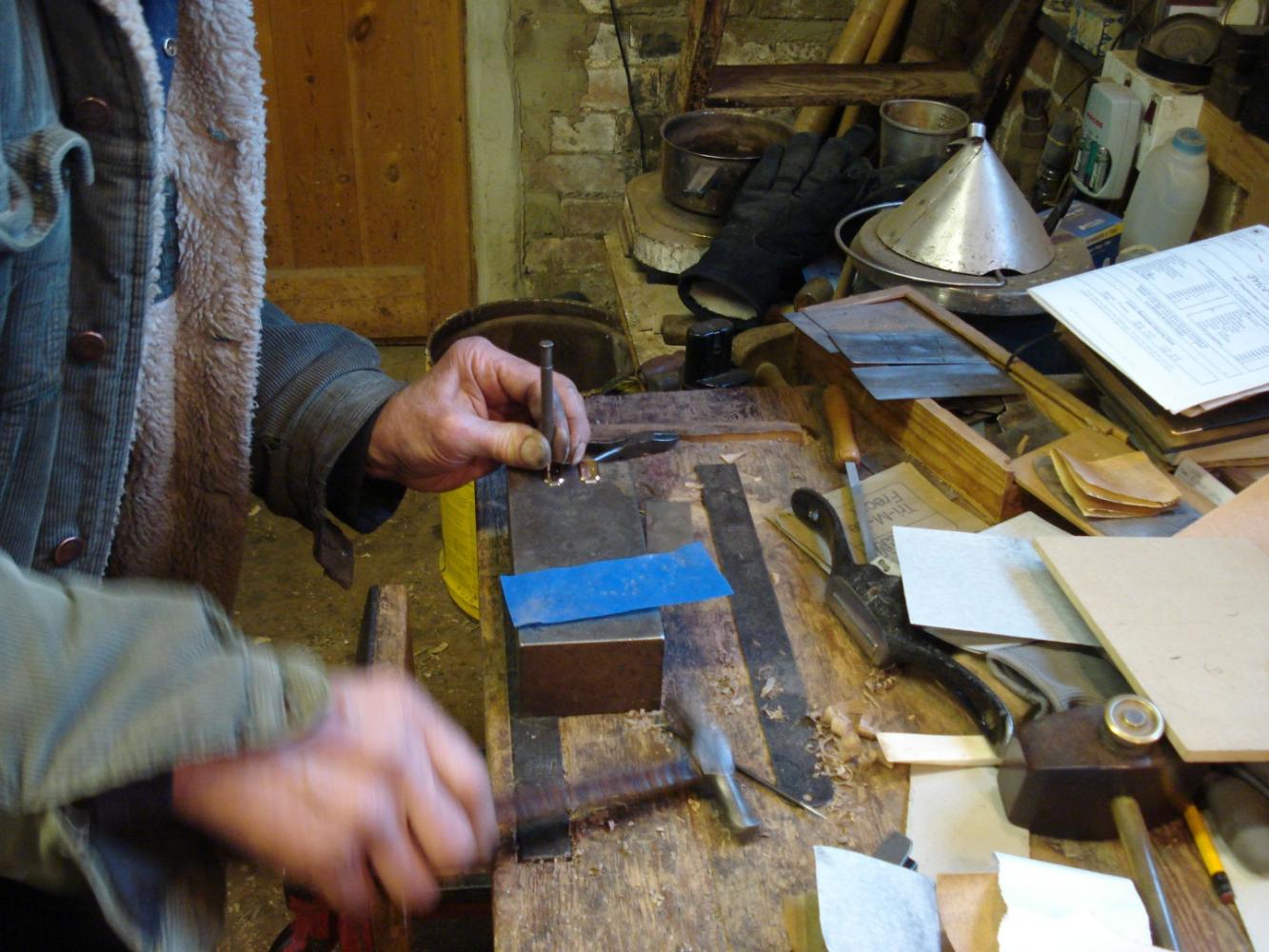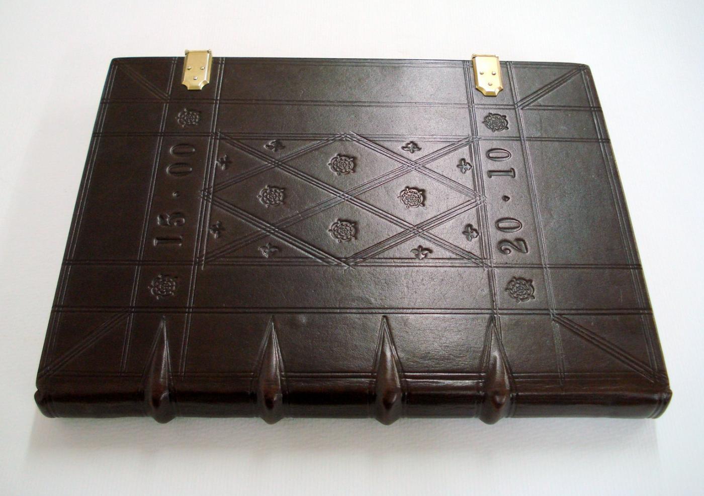 This is a family history which I bound in full leather on oak boards with heavy raised bands, and blind tooled in the style of a binding of around 1500. The pages of the book are folded sections of manuscript vellom which I sewed onto heavy cords in a sewing frame. I had brass clasps made for this job as it was going to be filled with gilt illuminations, and would therefore benefit from being held clamped shut. I kept a record of some of the processes involved in the binding.